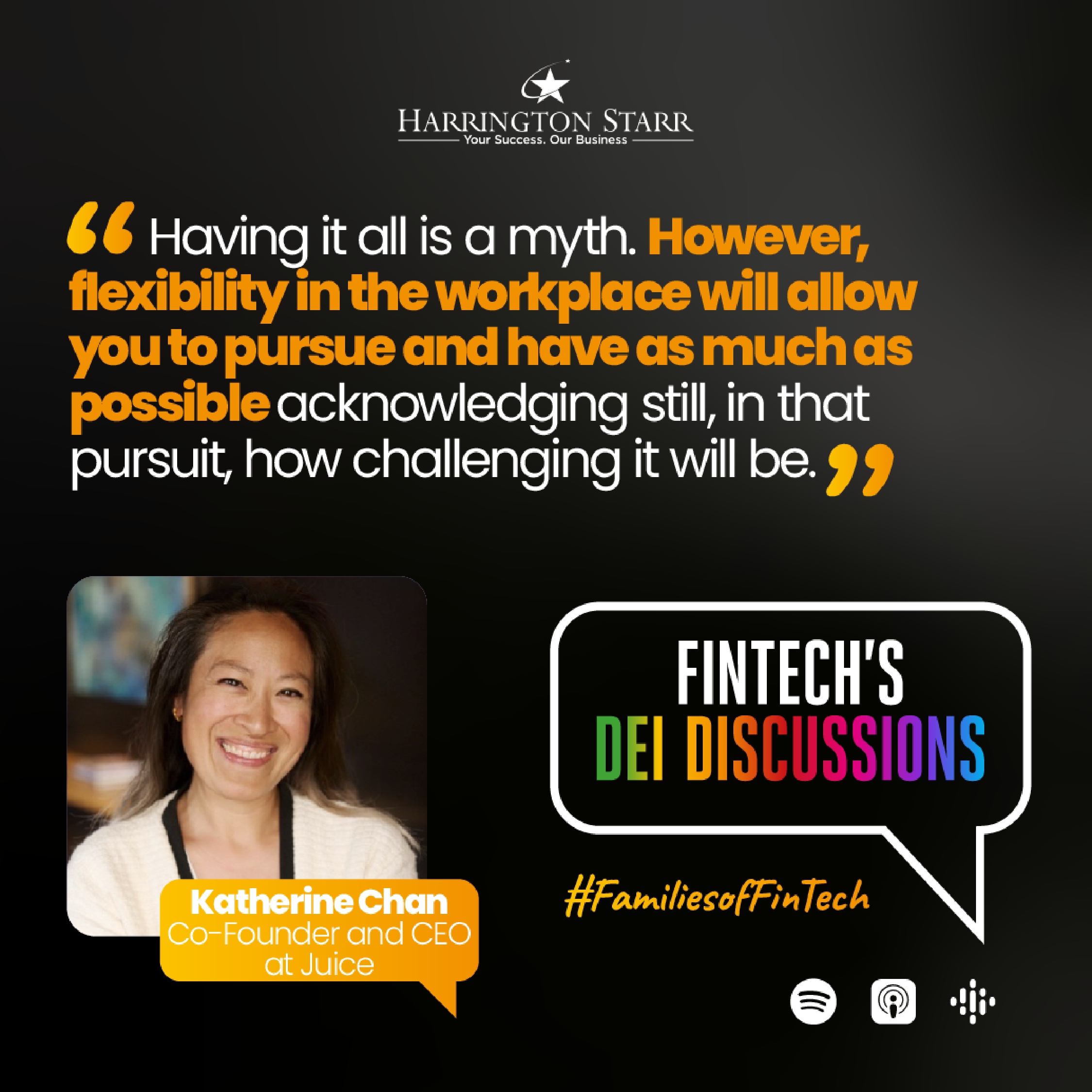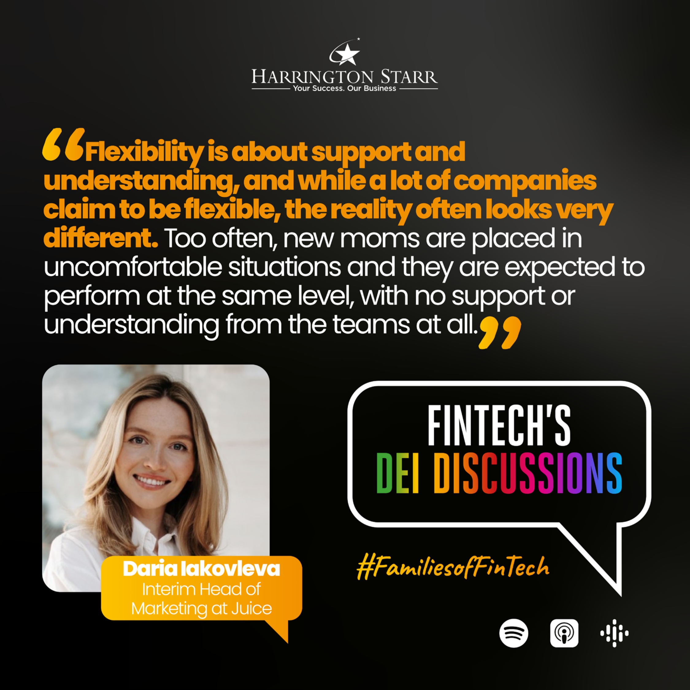 Our team has always believed that success should not come at the cost of wellbeing. During the Families of FinTech roundtable with Harrington Starr, the Juice mums team: Katherine Chan, Katie Richardson, Daria Iakovleva, and Gina Bley, spoke openly about what it really means to build a career while building a life. The conversation quickly moved beyond motherhood. It became a wider reflection on leadership, flexibility, and how work should align with life, not compete with it.